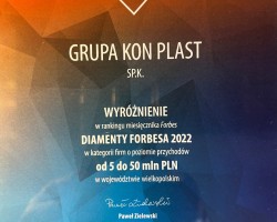 Wyróżnienie dla Grypy Kon-Plast Sp. z o.o. przyznano w kategorii firm o przychodach od 5 do 50 mln zł, w województwie wielkopolskim.