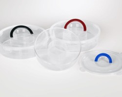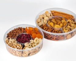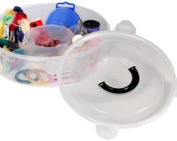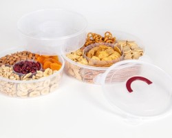 The round container have a wide range of purpose. It has built-in partitions and an airtight lid with a handle. It is useful while traveling or on the grill. It is made of plastic intended for contact with food. Works as an organizer for small items in every home.